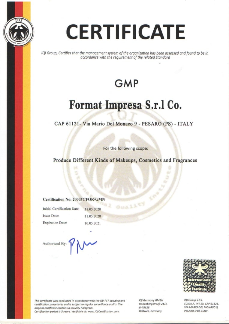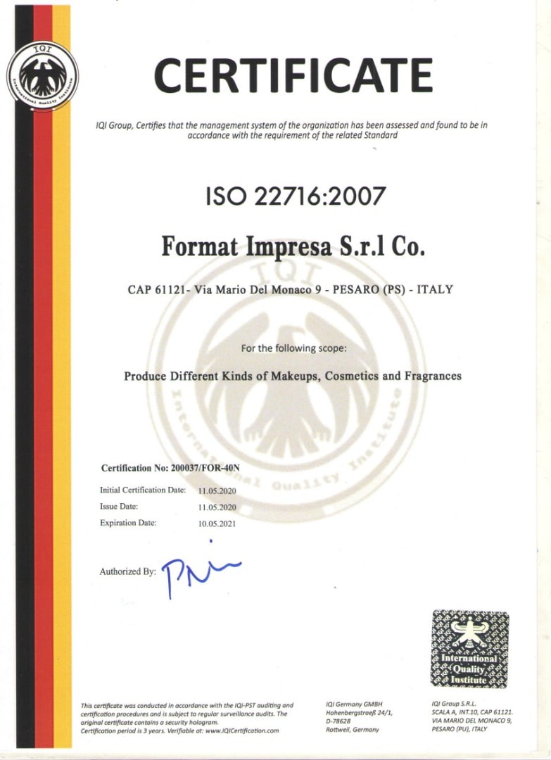 we were UNI EN ISO 22716 certified. In other words, we comply with the guidelines (GMP - Good Manufacturing Practices) required by Reg. 1223/2009, control, storage and shipping of cosmetic products. By so doing we guarantee the best safety standards for the consumer and we adopt standardized management of the human, technical and administrative factors involved in the production process.